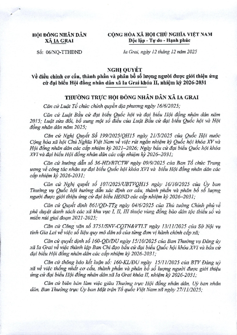 | Tiêu đề văn bản | Nghị quyết về việc điều chỉnh cơ cấu, thành phần và phân bổ số lượng người được giới thiệu ứng cử đại biểu HĐND xã ia Grai khóa II, NK 2026-2031 | ||