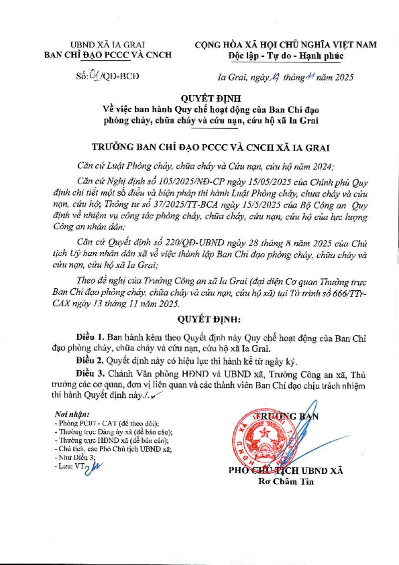 | Tiêu đề văn bản | Quyết định ban hành Quy chế hoạt động của BCĐ PCCC và cứu nạn cứu hộ xã Ia Grai | ||