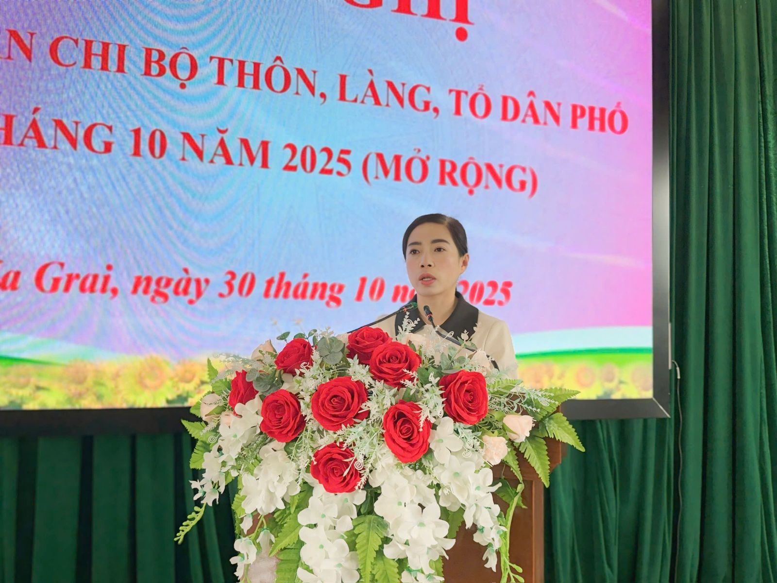 Đồng chí Nguyễn Thị Phương Thảo, Phó Bí thư Thường trực Đảng ủy xã Ia Grai đề nghị các chi bộ, thôn, làng và tổ dân phố tập trung thực hiện tốt các nhiệm vụ trọng tâm trong công tác xây dựng Đảng và hệ thống chính trị ở cơ sở. Đồng chí yêu cầu các Chi bộ khẩn trương rà soát, đôn đốc và hoàn thành chỉ tiêu phát triển đảng viên mới trong năm 2025; đồng thời lập danh sách, tạo điều kiện để đảng viên dự học và chuyển Đảng chính thức đúng quy định. Đồng chí cũng lưu ý các chi bộ cần tăng cường ứng dụng công nghệ thông tin trong công tác Đảng, triển khai hiệu quả sổ tay điện tử, sổ cá nhân điện tử; giao đảng viên trẻ có kỹ năng công nghệ hướng dẫn, hỗ trợ đồng chí trong chi bộ. Phó Bí thư Thường trực Đảng ủy xã yêu cầu các đơn vị hoàn thành kế hoạch kiểm tra, giám sát trong năm, chuẩn bị chu đáo công tác tổ chức Ngày hội Đại đoàn kết toàn dân tộc 18/11; rà soát kinh phí và lựa chọn đơn vị tổ chức điểm phù hợp. Các tổ chức Mặt trận, đoàn thể cần xây dựng chương trình hành động bám sát hai khâu đột phá của Đảng bộ xã là “làm thay đổi nếp nghĩ, cách làm trong vùng đồng bào dân tộc thiểu số” và “đẩy mạnh chuyển đổi số”, góp phần thực hiện thắng lợi nghị quyết đề ra.