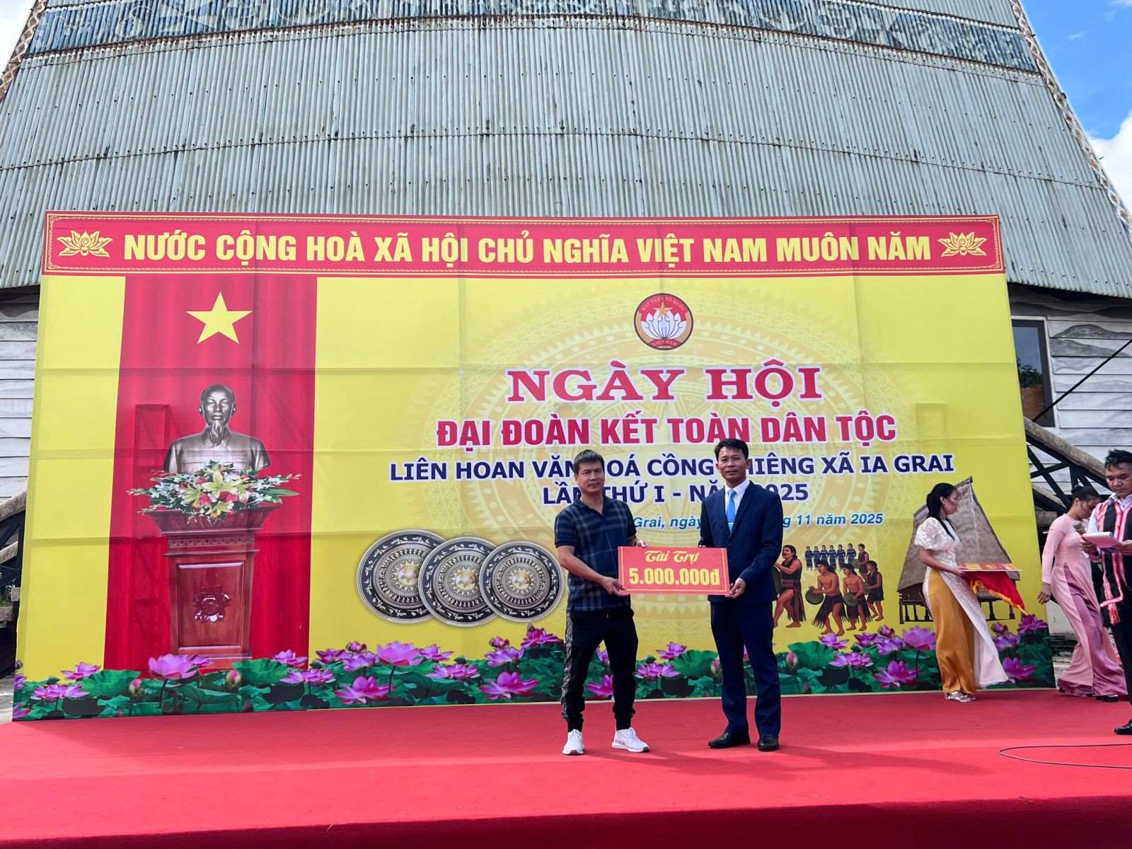 Tại ngày hội, đại diện các doanh nghiệp, hộ kinh doanh trong và ngoài xã đã trao kinh phí hỗ trợ Uỷ ban MTTQ Việt Nam xã tổ chức liên hoan văn hoá cồng chiêng lần thứ I, năm 2025. Theo đó, Công ty TNHH MTV Sơn Huyền Phát hỗ trợ 10 triệu đồng; Công ty Cổ phần Thuỷ điện Phan Vũ hỗ trợ 5 triệu đồng; Công ty Cổ phần Thuỷ điện Sông Đà – Ia Grai: 5 triệu đồng; Công ty Cổ phần Thuỷ điện Quốc Cường: 2 triệu đồng; Công ty Cổ phần Cà phê Gia Lai: 5 triệu đồng; Công ty TNHH MTV Cà phê Ia Grai: 5 triệu đồng; Công ty Cà phê Ia Sao I: 3 triệu đồng; Công ty Cổ phần Nhiễn Minh Gia Lai: 5 triệu đồng. Công ty TNHH Doanh nghiệp xã hội từ thiện và hỗ trợ phát triển cộng động Fly To Sky tặng sách giáo khoa và đồ dùng học tập cho học sinh Trường PTDT Nội trú xã.
