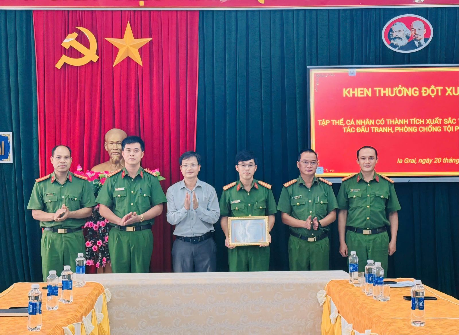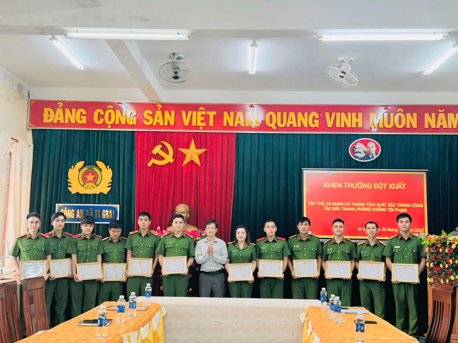 Tại buổi lễ, đồng chí Ngô Văn Khoa đã công bố Quyết định tặng giấy khen của Chủ tịch UBND xã cho 1 tập thể và 12 cá nhân (trong đó có 11 cán bộ, chiến sỹ công an xã Ia Grai và 1 cán bộ công an xã Ia Krái) đã thành tích xuất sắc trong việc phát hiện, điều tra và bắt giữ các đối tượng các vụ án xảy ra trong thời gian gần đây. Trong đó, gồm có các vụ án: cướp, h..i*p, gi*t người xảy ra ngày 7/10/2025 tại làng Mèo; vụ án tàng trữ trái phép chất ma túy xảy ra ngày 10/10/2025 tại Tổ dân phố 3 và vụ án tàng trữ trái phép chất ma túy xảy ra ngày 13/10/2025 tại Nhà nghỉ 289, Tổ dân phố 3, xã Ia Grai.