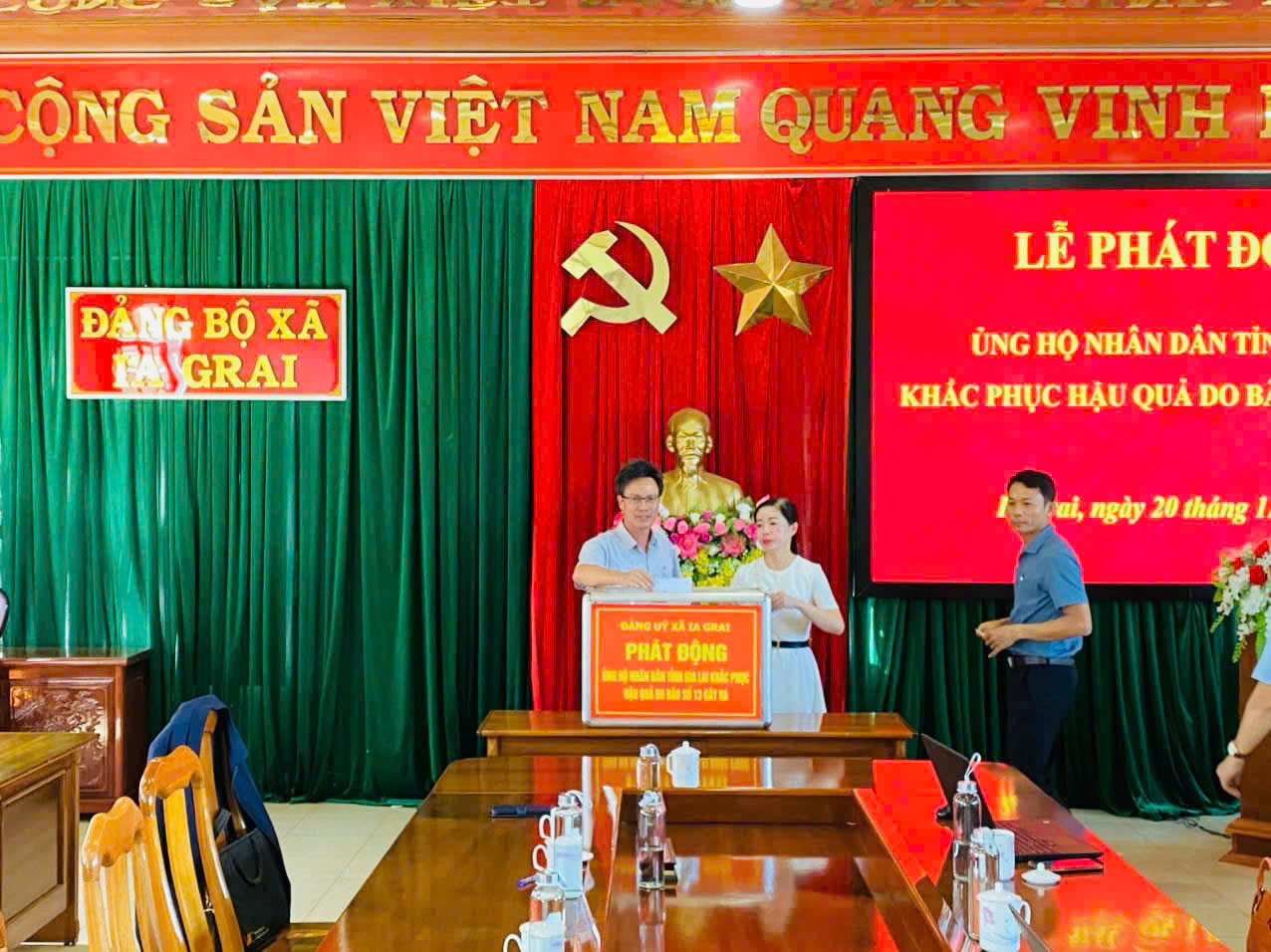 Tại lễ phát động, đồng chí Nguyễn Xuân Bổn, Chủ tịch Uỷ ban MTTQ Việt Nam xã đã đọc thư của Uỷ ban MTTQ Việt Nam tỉnh Gia Lai kêu gọi toàn thể cán bộ, công chức viên chức đang công tác trong các cơ quan, đơn vị hưởng lương từ ngân sách nhà nước; các doanh nghiệp, hộ kinh doanh và bà con nhân dân trên địa bàn với tinh thần “lá lành đùm lá rách”, mọi người cùng chung tay ủng hộ tiền, vật dụng thiết yếu để giúp đỡ các hộ dân trên địa bàn tỉnh sớm khắc phục thiệt hại do các trận bão, lụt trong thời gian vừa qua. Mọi sự đóng góp của các tổ chức, cá nhân được chuyển về Uỷ ban MTTQ Việt Nam tỉnh để kịp thời hỗ trợ, giúp đỡ người dân bị thiệt hại.
