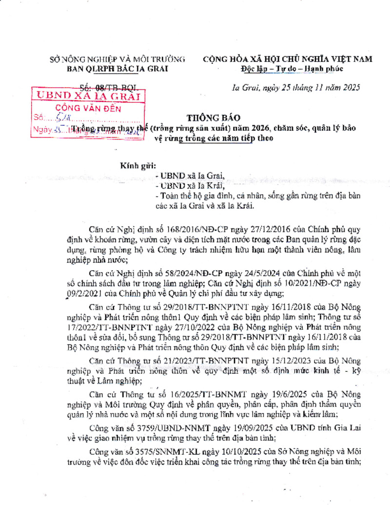 | Tiêu đề văn bản | Thông báo trồng rừng thay thế (trồng rừng sản xuất) năm 2026, chăm sóc, quản lý bảo vệ rừng rồng các năm tiếp theo | ||
